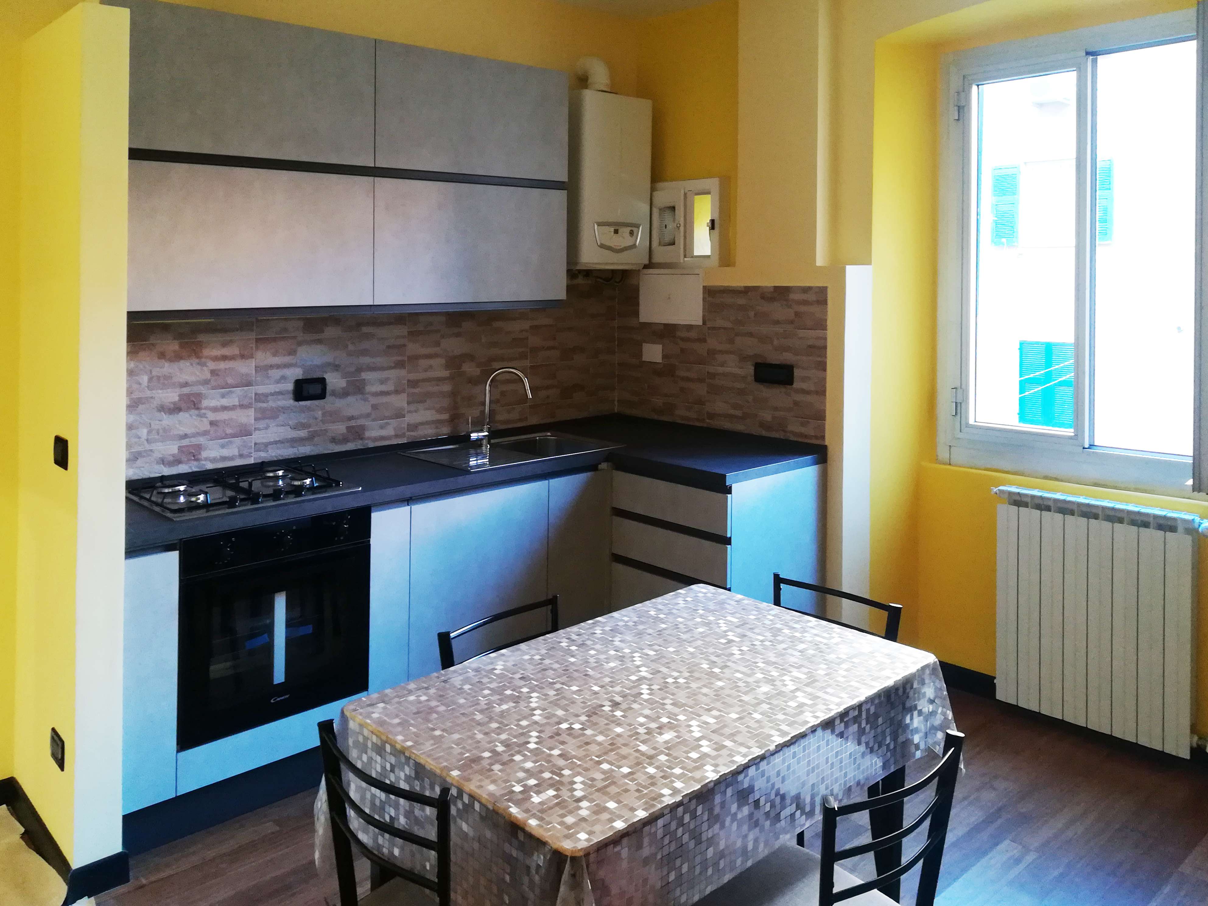 Cucina e bagno sono stati integralmente ridisegnati e rivestiti di gres effetto pietra.