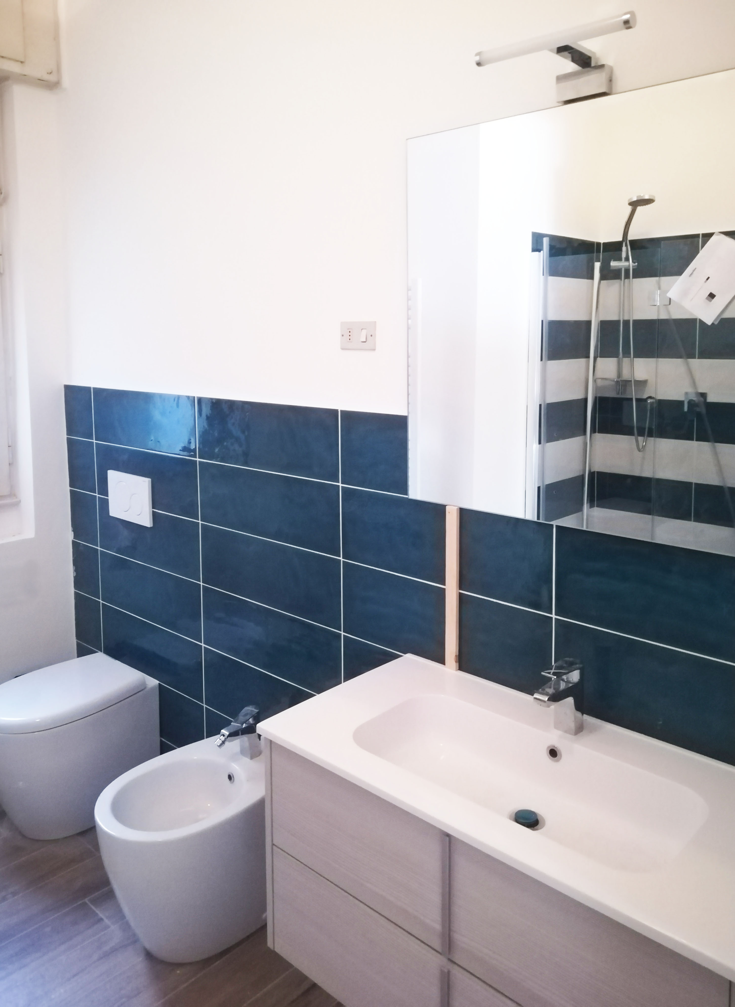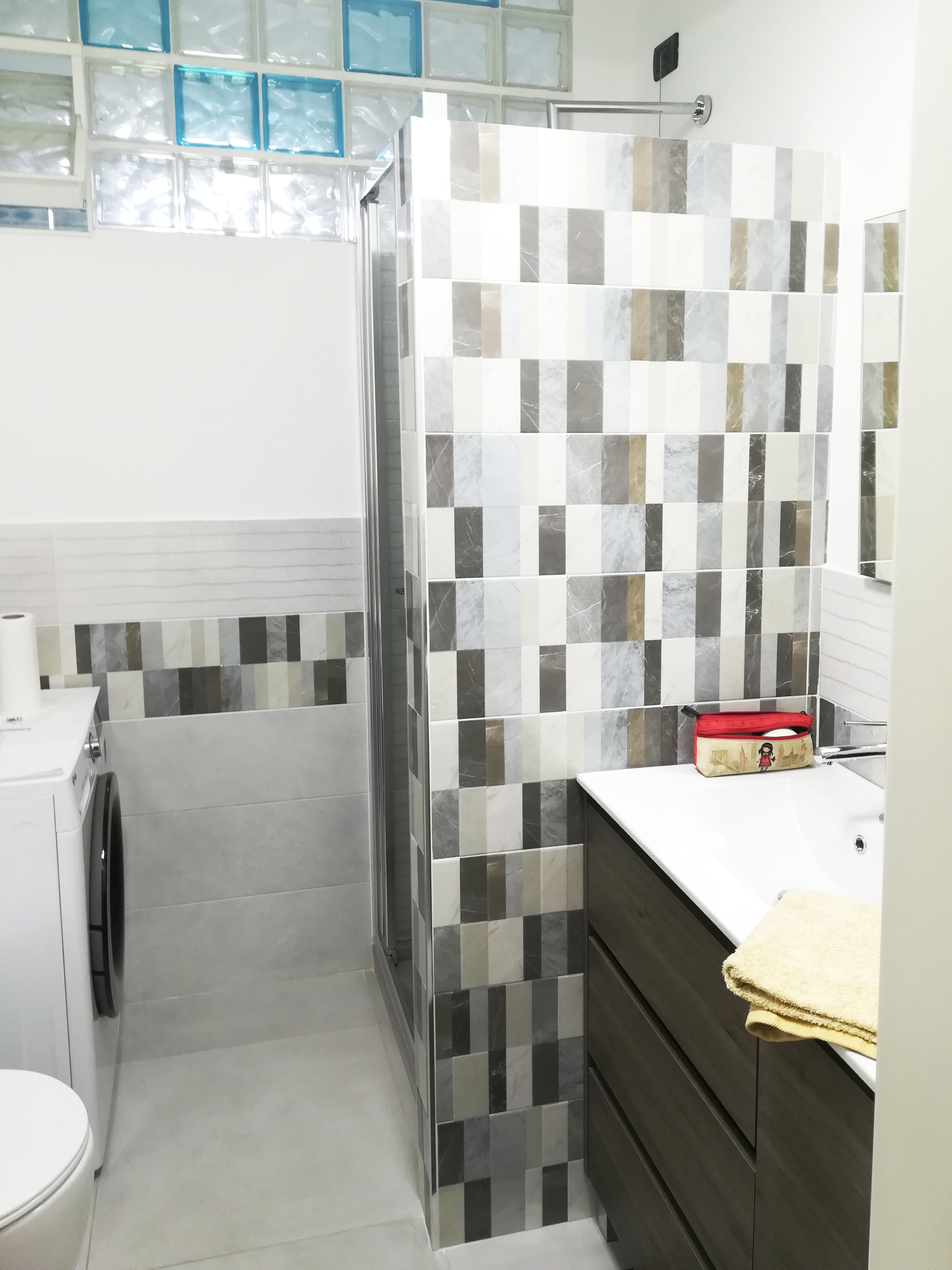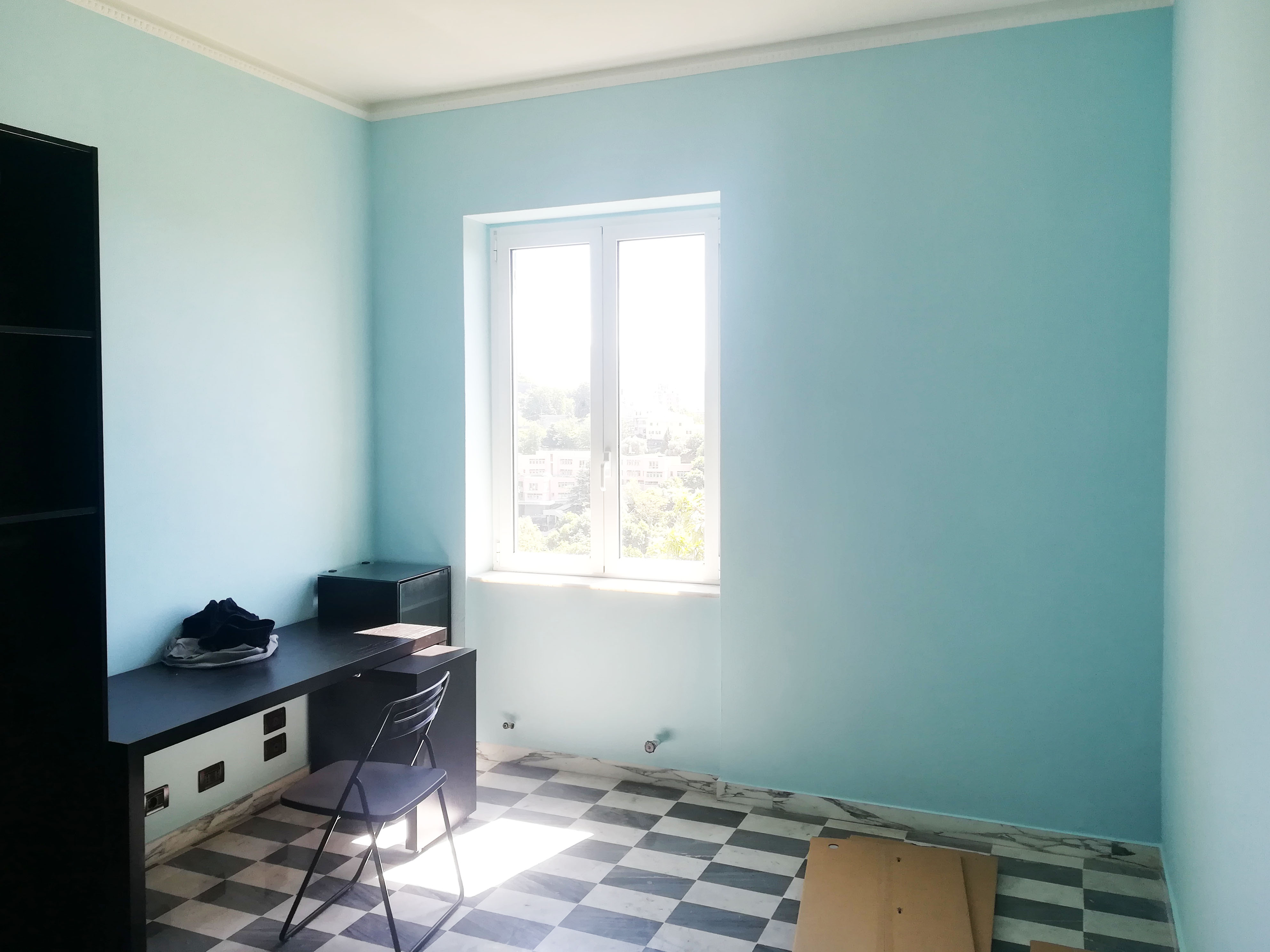 Ogni vano è stato caratterizzato con un colore alle pareti. Le piastrellature dei bagni sono state progettate in modo da richiamare la pavimentazione a scacchiera dell’appartamento.