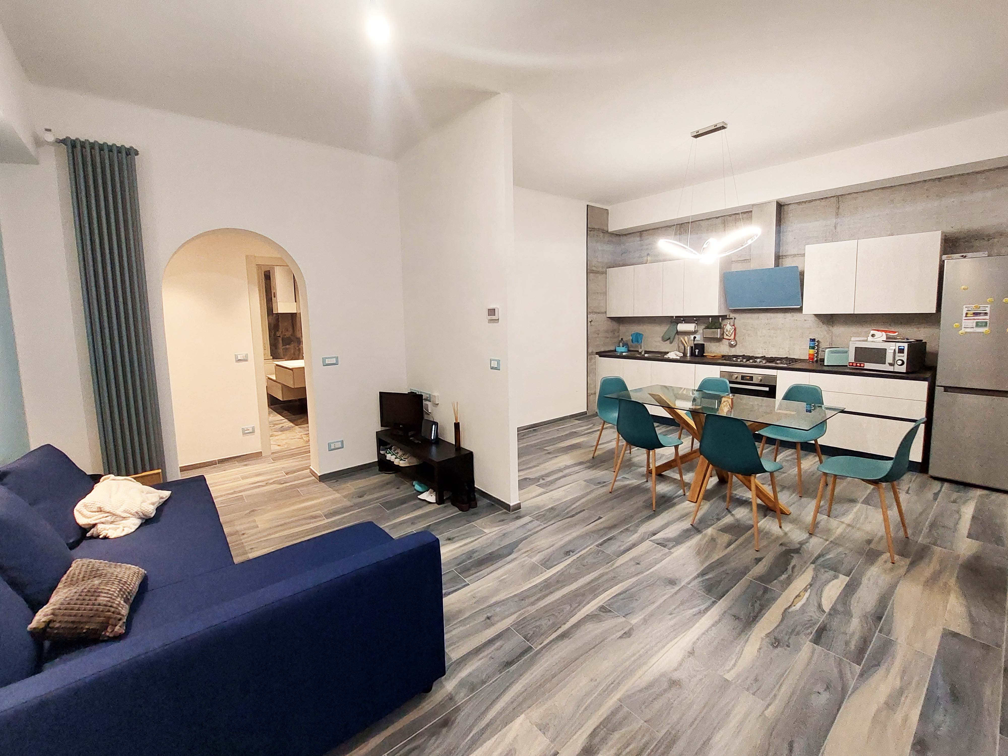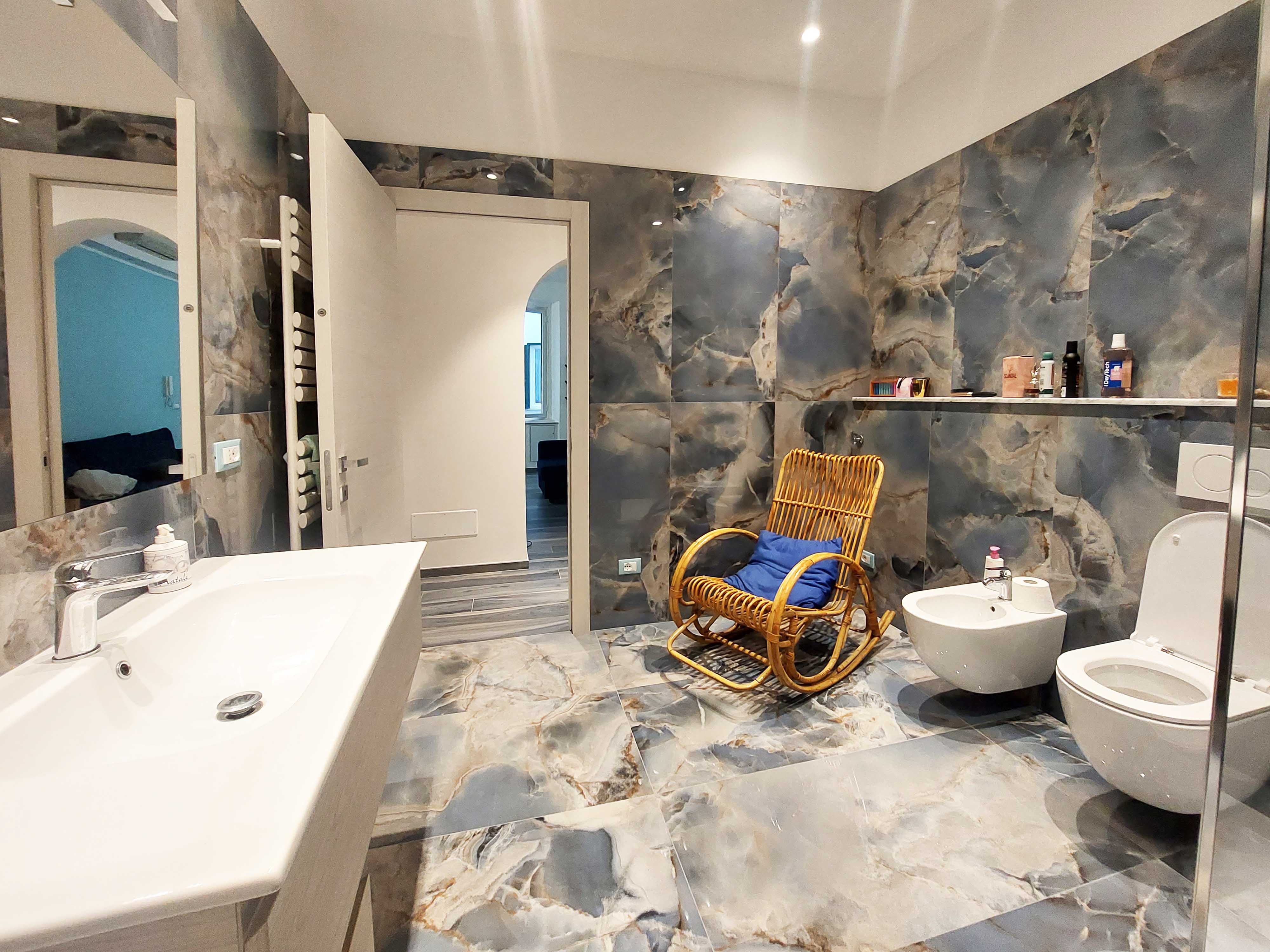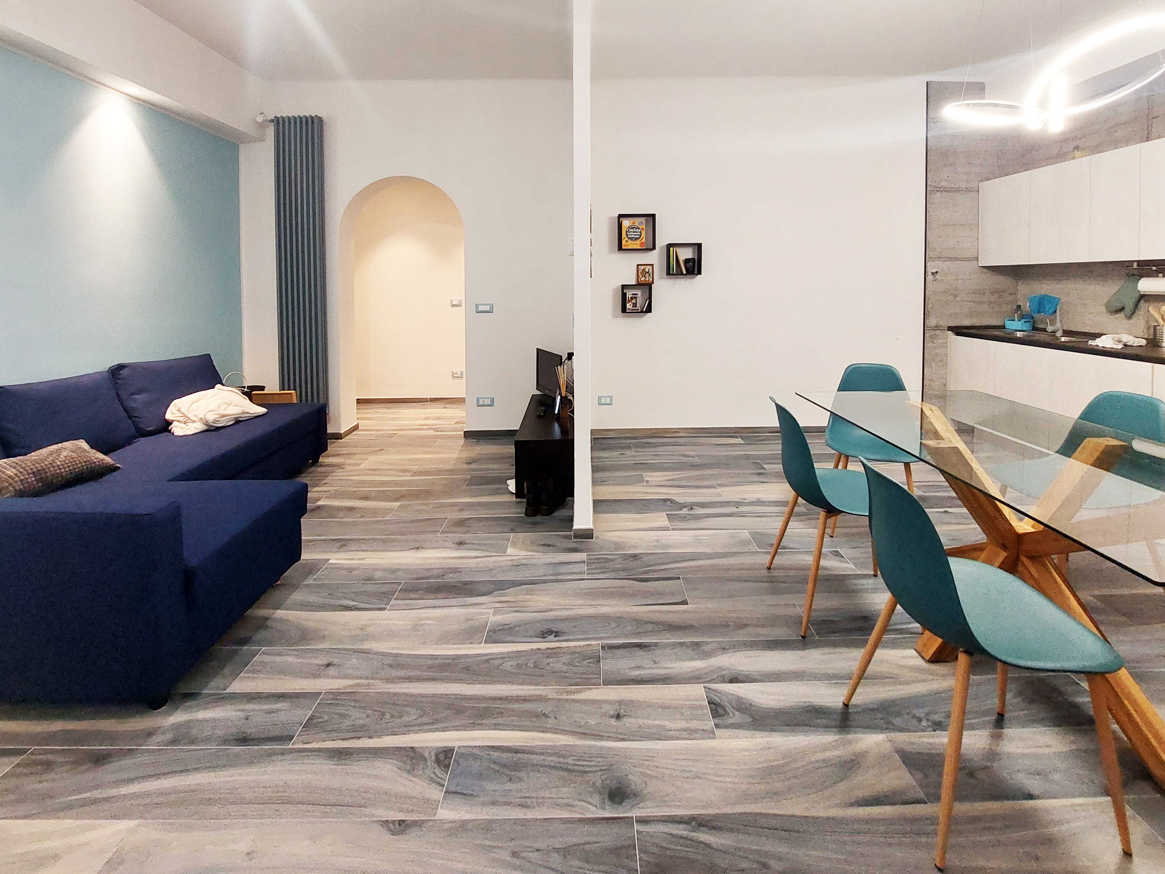 La casa è stata interamente rifatta in ogni sua componente, dandole un look in stile marittimo, con gradazioni di azzurro che caratterizzano l’intero appartamento, sia nelle pavimentazioni in gres effetto legno, sia nelle pareti, sia nella scelta degli arredi.