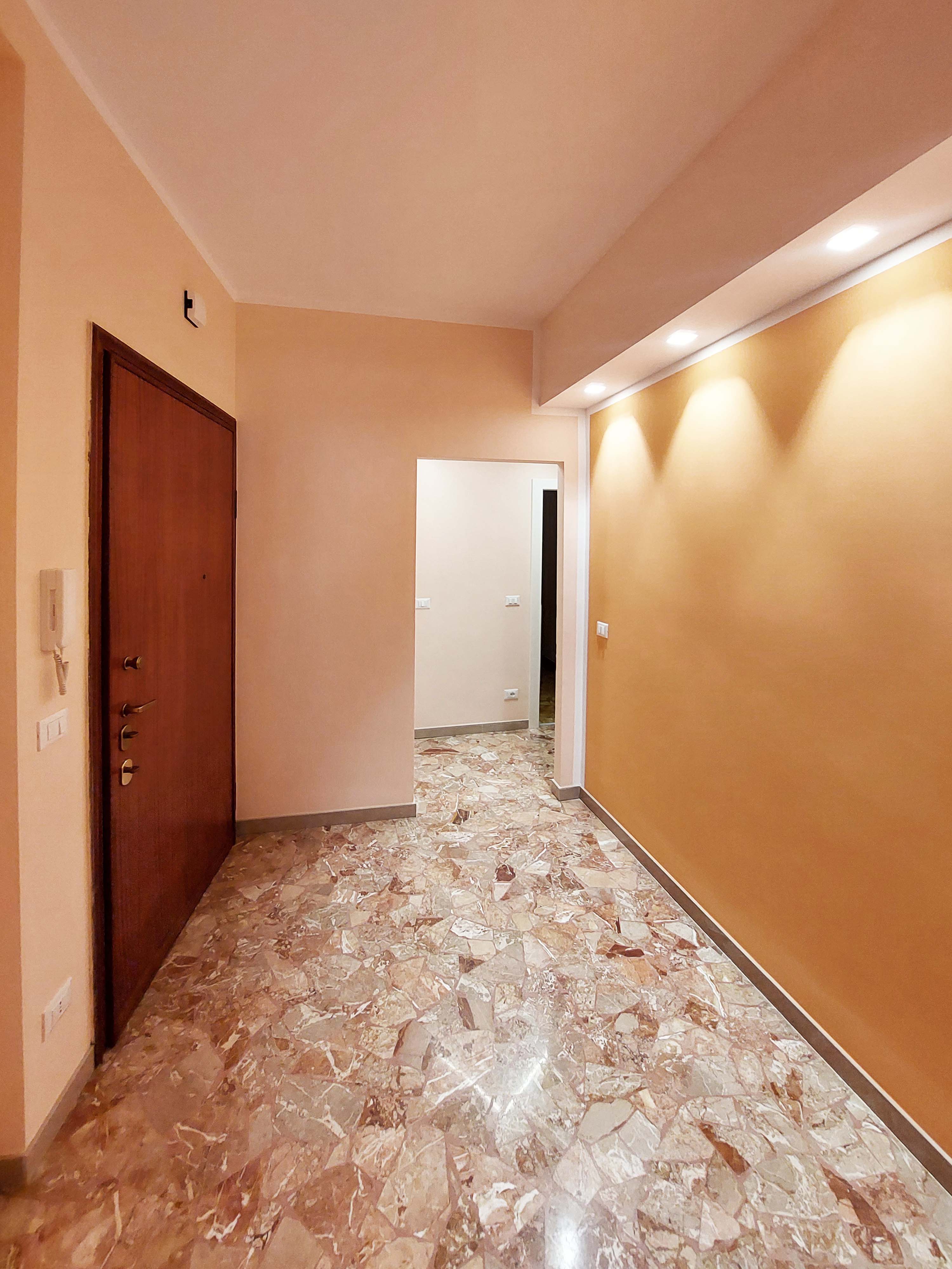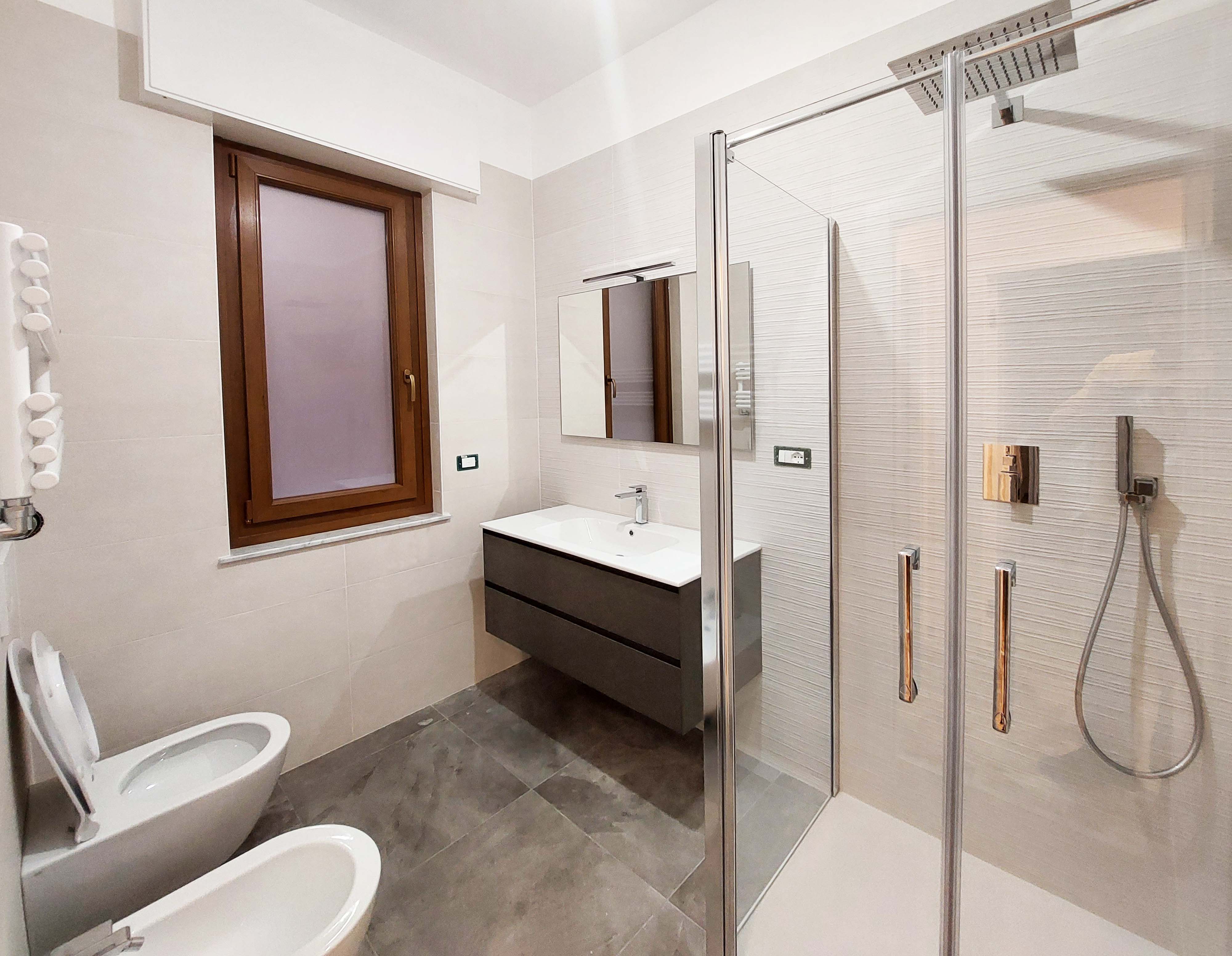L’ingresso conduce da una parte alla zona notte e dall’altra alla zona giorno. Ogni zona ha il proprio bagno dedicato.