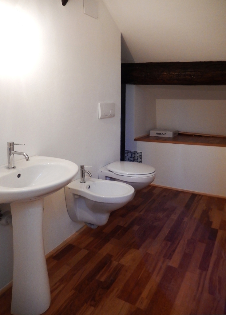 E’ stato interamente reinventato il bagno, creando un apposito vano di adeguate misure, mentre la zona vasca, con la sua bellissima pavimentazione mosaicata, è stata ricavata nel piccolo spazio occupato dal vecchio bagno.