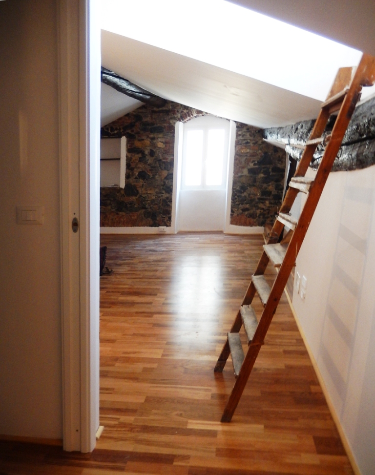 L’appartamento è situato all’ultimo piano di un antico edificio, vincolato dalla Soprintendenza ai beni architettonici e paesaggistici, situato in prossimità della cattedrale di Genova.