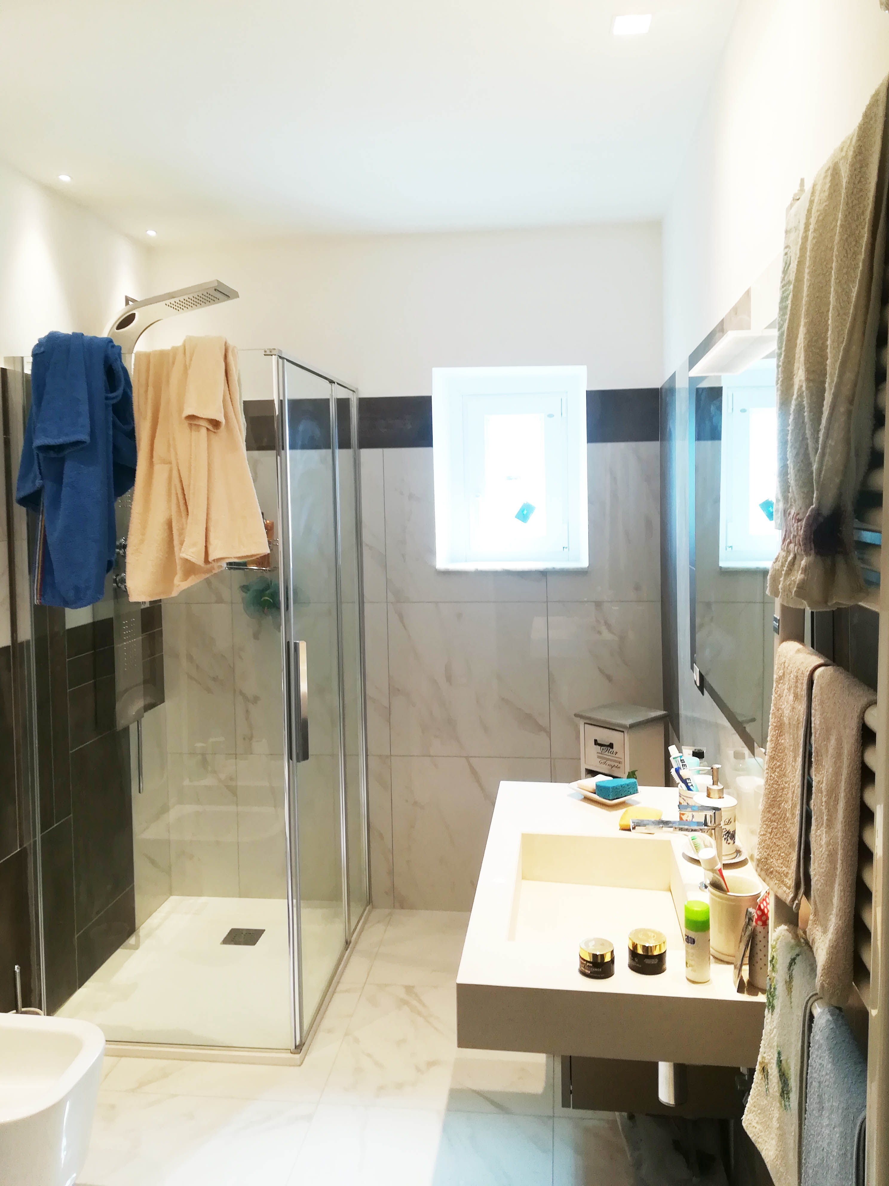 Nei bagni, dove alternano mosaici a zone piastrellate a zone con pareti decorate, come negli altri ambienti, un gioco di altezze dei controsoffitti movimenta gli spazi, creando sempre punti di vista diversi.
