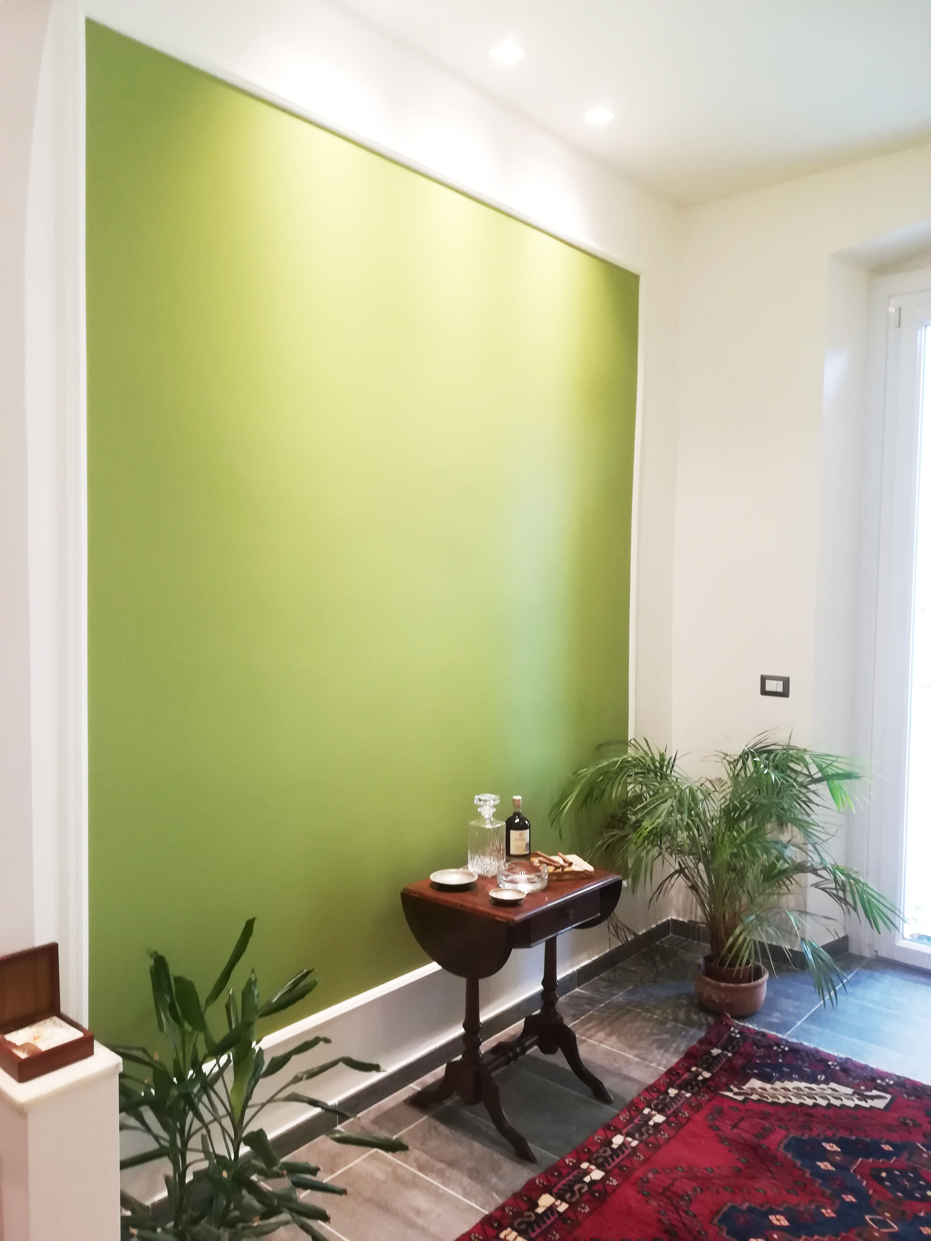 La casa ha un forte carattere dovuto in particolar modo alle tinte decorative che spiccano in tutti gli ambienti. Colori che donano tanta eleganza e stile ad ogni angolo della casa.