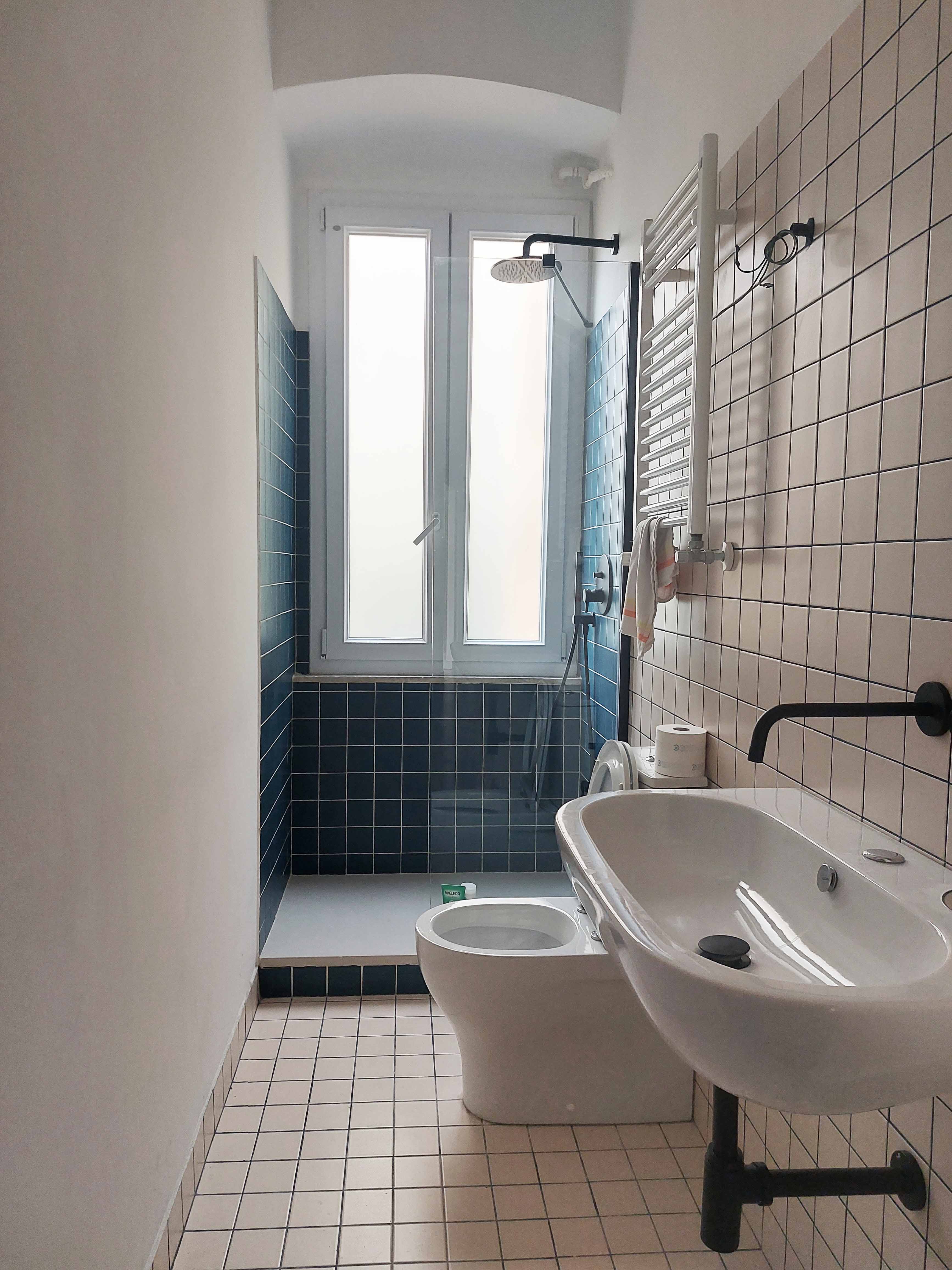 Il bagno è interamente rivestito da piccole piastrelle quadrate colorate, con gli stucchi posti in negativo al colore della piastrella.