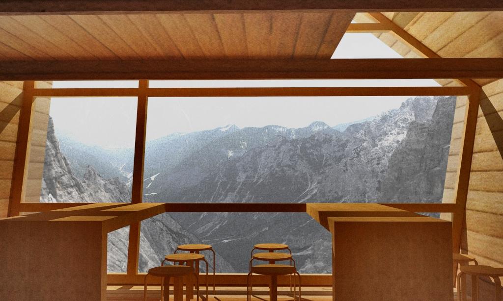Ad est è presente una grande vetrata che si affaccia sulla vallata, permettendo al primo sole di penetrare all’alba nel rifugio, a segnare che è l’ora di lasciarlo e di partire.