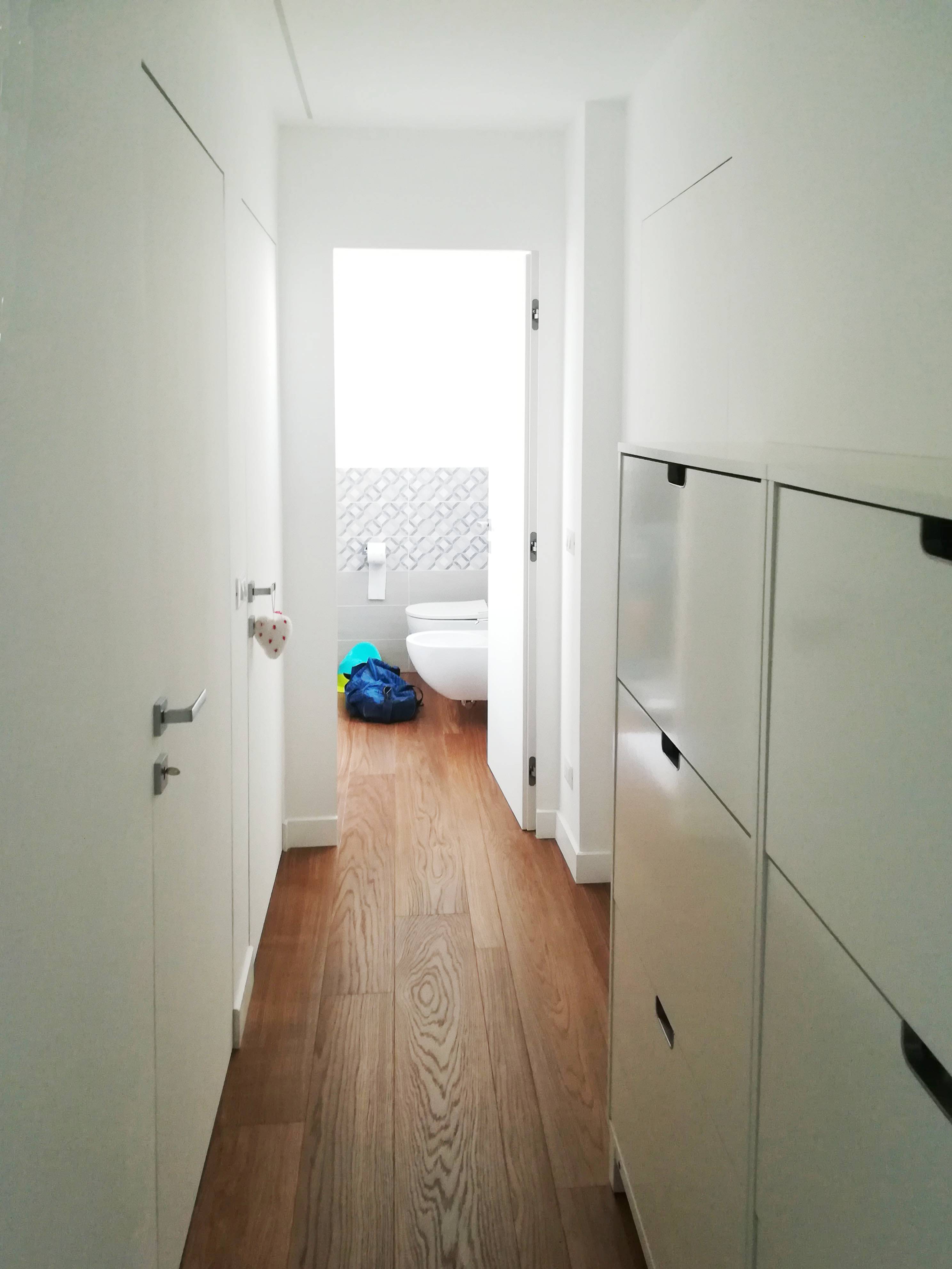 Pavimentazioni in parquet di grande formato essenza rovere si estendono per tutta la casa, in armonia con il look total white dell’abitazione.