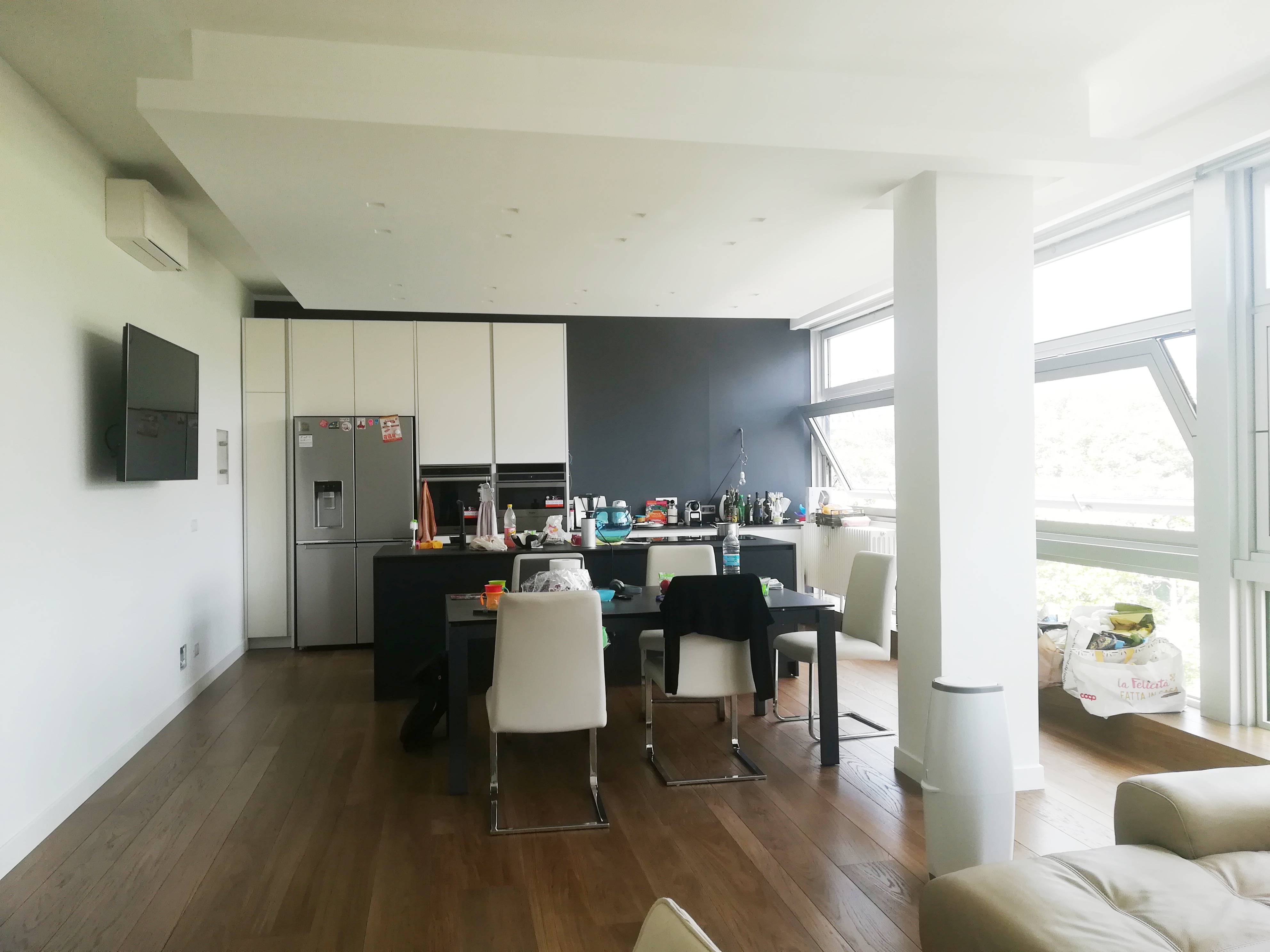 Un grande salone con una intera parete vetrata caratterizza l’abitazione. Questo è il punto focale della casa ed il luogo della zona giorno, organizzata totalmente in rapporto alla grande vetrata.