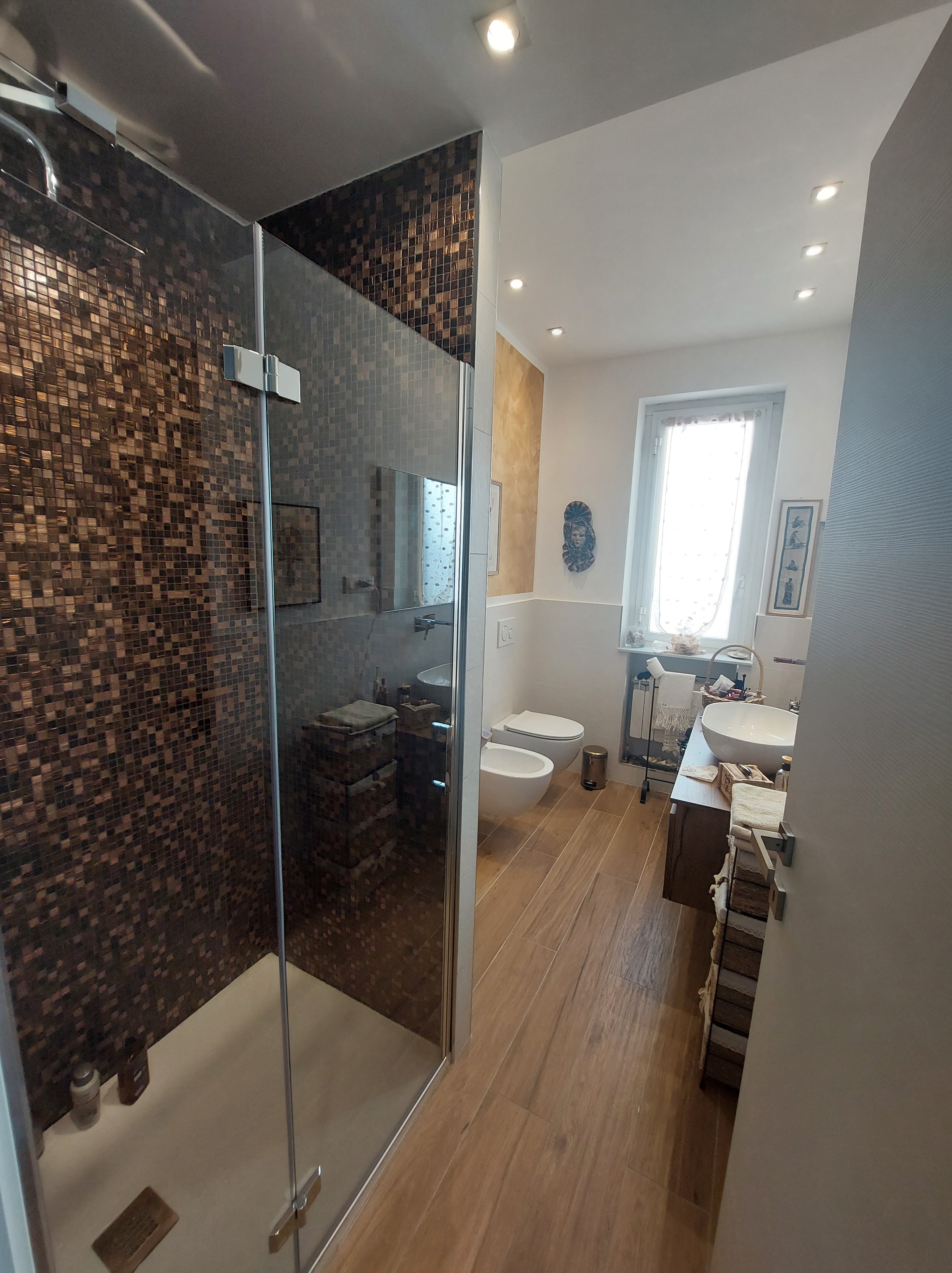 Nei bagni, dove alternano mosaici a zone piastrellate a zone con pareti decorate, come negli altri ambienti, un gioco di altezze dei controsoffitti movimenta gli spazi, creando sempre punti di vista diversi.