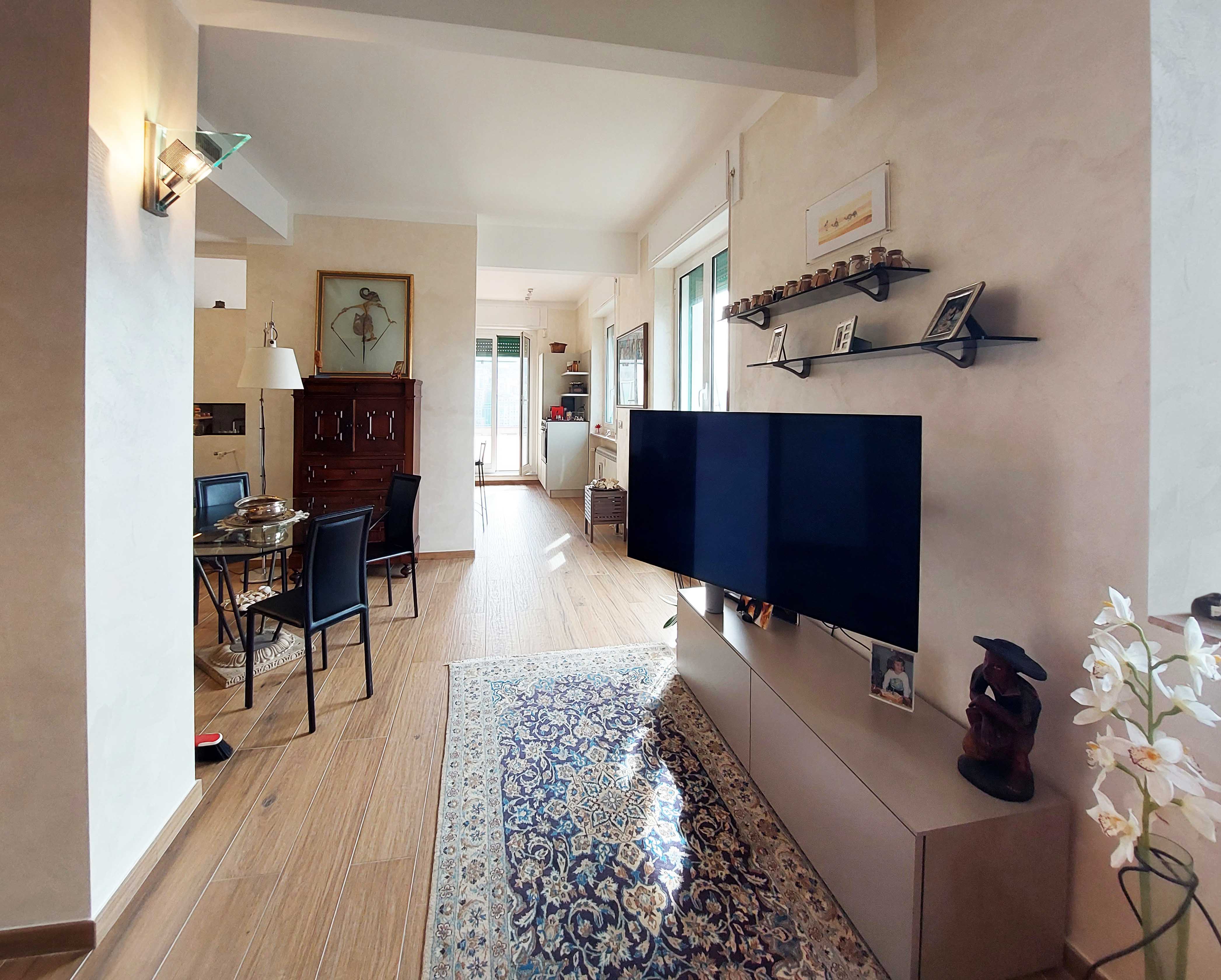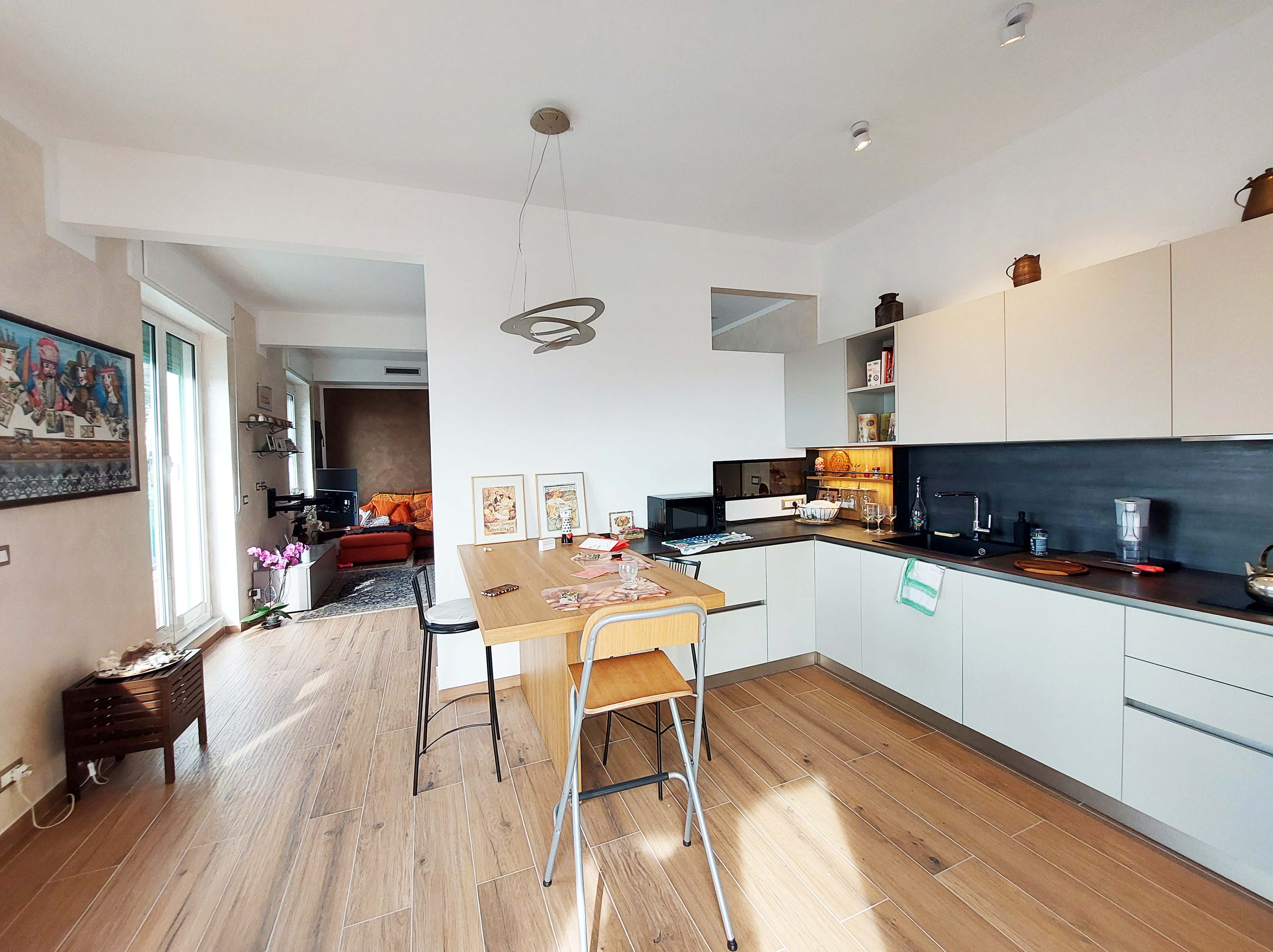 La zona giorno è stata incentrata attorno al grande terrazzo che contraddistingue l’abitazione. E’ stato creato un unico grande ambiente da ingresso a cucina, passando dalla sala e dalla distribuzione alle camere, mantenendo allo stesso tempo una separazione visiva tra queste zone.