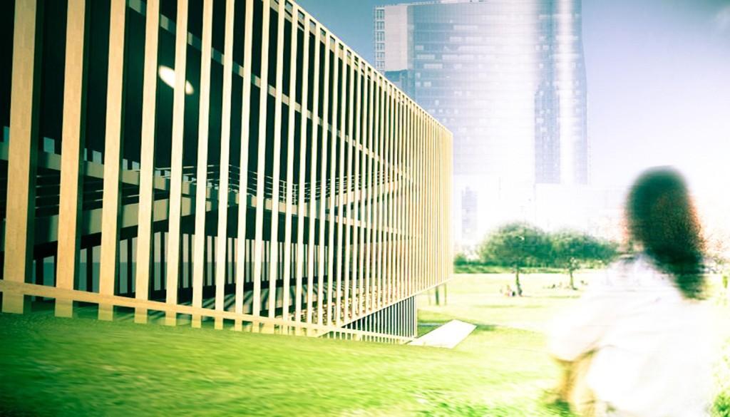 Il progetto consiste in un edificio che non compete in dimensioni con i “giganti” che lo circondano: li guarda con un certo stupore per come si è trasformata l’area e con grande interesse nell’attesa che fiorisca il parco.