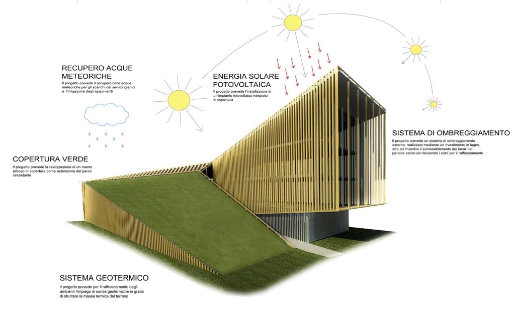 Dichiara la propria vocazione paesaggistica emergendo dal parco e si riveste di materiali naturali a precisare la propria identità di architettura sostenibile.